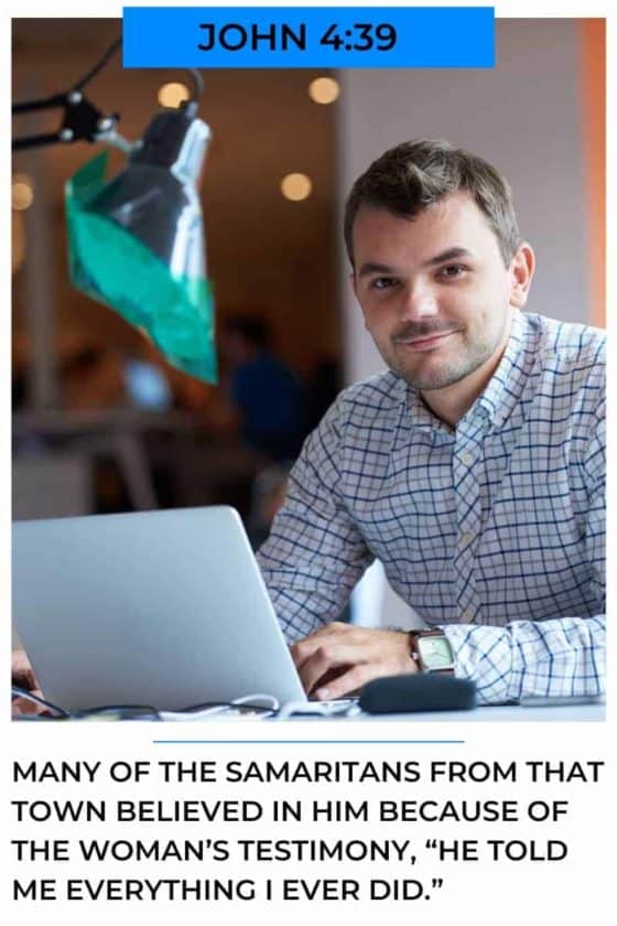 Often we think we’re not qualified to talk about Jesus or religion in the workplace. Matters of opinion, like religion and politics are off limits. Besides, many people notice lately how easily you can get fried for speaking out in our social medial world these days. Everything is a sound bite. But when you trust Christ, you are qualified to talk about what he has done for you. Notice this verse. The Samaritan woman is credited with many Samaritans believing. She simply told them about her interaction with Jesus.